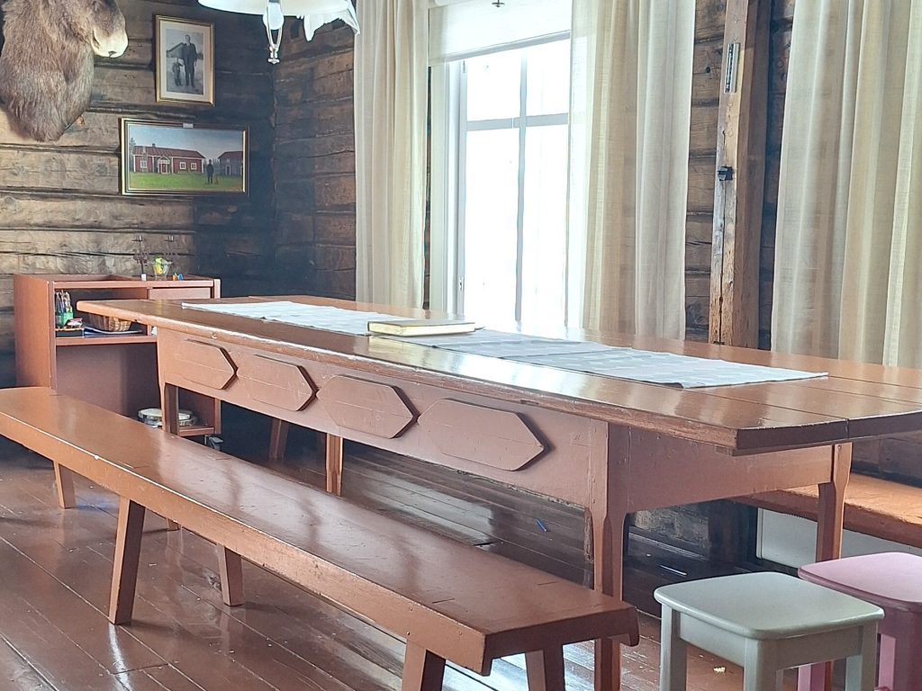 Päärakennuksesta löydät ihanan tunnelmallisen tuvan pitkine pöytineen. Lisäksi päärakennuksessa on hyvin varusteltu keittiö, kaksi makuuhuonetta alakerrassa sekä kaksi makuuhuonetta yläkerrasta.